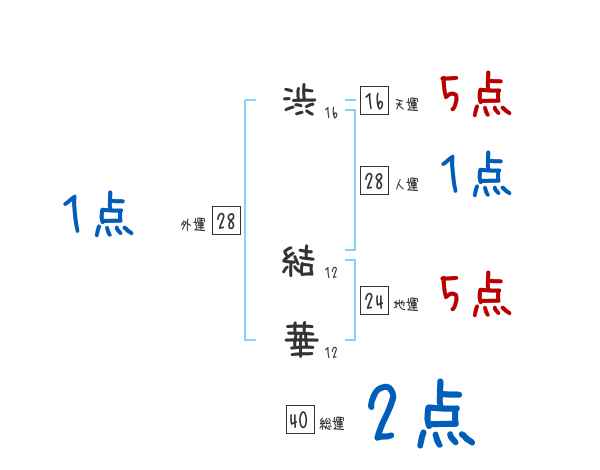 外運![]() | 渋結華さんの外運は28画の1つ星!家庭環境に注意。スポーツで活躍できる能力があるかも。 生活面を象徴する運勢です。外部から受ける影響力を表し、結婚運、家庭運や職場、環境への順応性を表します。 |
