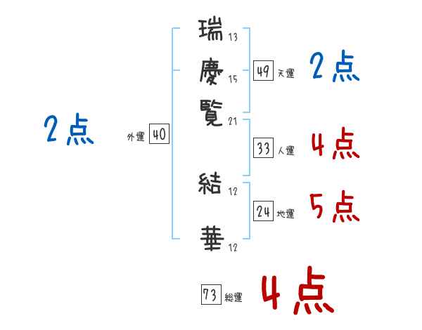 天運![]() | 瑞慶覧結華さんの天運は49画の2つ星!不安定な性格で明暗がある人生。周りの人には支援されやすい。 家系が持つ宿命的な運勢を表します。祖先から受け継いだ苗字ですので自分の力が及びません。家柄を象徴します。 |