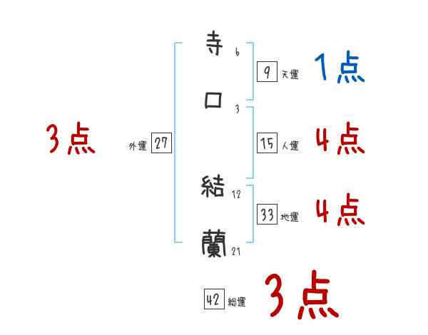 総運![]() | 寺口結蘭さんの総運は42画の3つ星!病気に注意。多芸であるが消極的でおとなしい。 あなたの人生を表す1番重要な運勢です。生涯を通じて影響する総合運となり、主に50歳以降の晩年期に影響を及ぼします。 |
