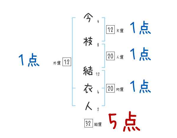 | 外運  | 今枝結衣人さんの外運は12画の1つ星!簡単な失敗で諦めてしまいやすいかも。着実に行動すると良いでしょう。生活面を象徴する運勢です。外部から受ける影響力を表し、結婚運、家庭運や職場、環境への順応性を表します。 |