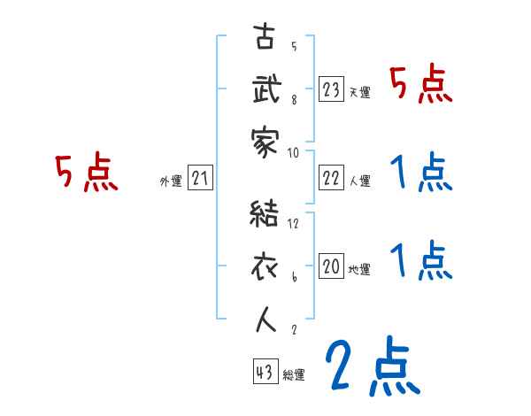 天運![]() | 古武家結衣人さんの天運は23画の5つ星!想像力に優れ活力がある。一代で成功し名誉を手に入れる。 家系が持つ宿命的な運勢を表します。祖先から受け継いだ苗字ですので自分の力が及びません。家柄を象徴します。 |