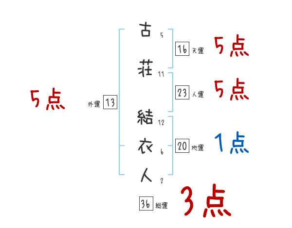 総運![]() | 古荘結衣人さんの総運は36画の3つ星!先見性が豊かです。多少神経質で苦労することも。 あなたの人生を表す1番重要な運勢です。生涯を通じて影響する総合運となり、主に50歳以降の晩年期に影響を及ぼします。 |