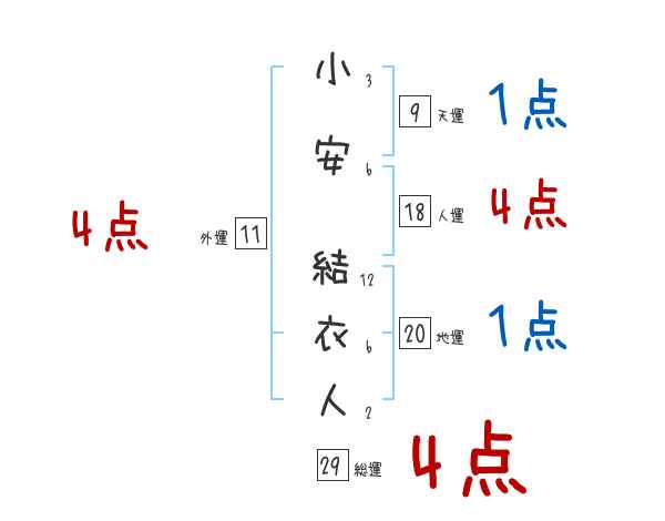総運![]() | 小安結衣人さんの総運は29画の4つ星!完全主義で才能がある。厳格な心の持ち主。 あなたの人生を表す1番重要な運勢です。生涯を通じて影響する総合運となり、主に50歳以降の晩年期に影響を及ぼします。 |