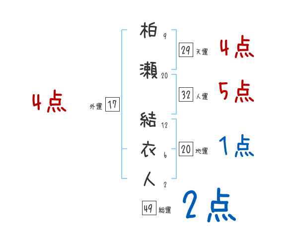 人運![]() | 柏瀬結衣人さんの人運は32画の5つ星!柔軟性があり成功する。チャンスが多く金運が良い。 性格や才能などを表す2番目に重要な運勢です。人間関係や協調性、社会的な成功に影響します。主に20歳から50歳ぐらいまでの中年期の運勢を表します。 |
