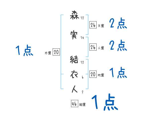 総運![]() | 森実結衣人さんの総運は46画の1つ星!迷走することが多く苦労するかも。目先のことにとらわれないように。 あなたの人生を表す1番重要な運勢です。生涯を通じて影響する総合運となり、主に50歳以降の晩年期に影響を及ぼします。 |