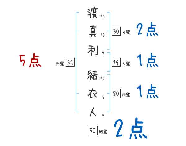 外運![]() | 渡真利結衣人さんの外運は31画の5つ星!社交性があり判断力に優れる。順風満帆な人生で円満な生活。 生活面を象徴する運勢です。外部から受ける影響力を表し、結婚運、家庭運や職場、環境への順応性を表します。 |
