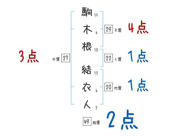人運![]() | 駒木根結衣人さんの人運は22画の1つ星!努力することが苦手ないっぽう手先が器用。芸術性にも優れる。 性格や才能などを表す2番目に重要な運勢です。人間関係や協調性、社会的な成功に影響します。主に20歳から50歳ぐらいまでの中年期の運勢を表します。 |