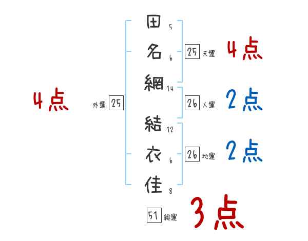 天運![]() | 田名網結衣佳さんの天運は25画の4つ星!個性があり才能があふれる。強運の持ち主で発展する。 家系が持つ宿命的な運勢を表します。祖先から受け継いだ苗字ですので自分の力が及びません。家柄を象徴します。 |