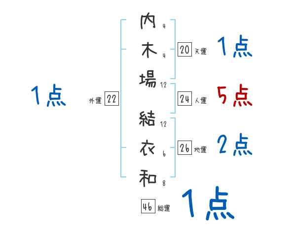 総運![]() | 内木場結衣和さんの総運は46画の1つ星!迷走することが多く苦労するかも。目先のことにとらわれないように。 あなたの人生を表す1番重要な運勢です。生涯を通じて影響する総合運となり、主に50歳以降の晩年期に影響を及ぼします。 |