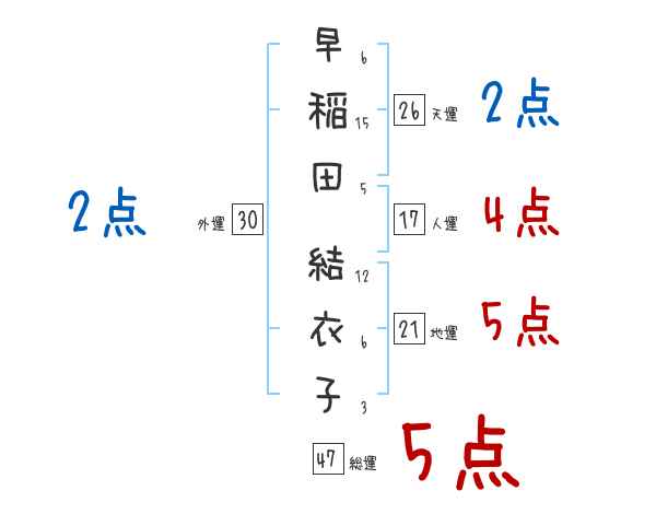 総運![]() | 早稲田結衣子さんの総運は47画の5つ星!実力が開花し発展する円満な人生。財に恵まれる。 あなたの人生を表す1番重要な運勢です。生涯を通じて影響する総合運となり、主に50歳以降の晩年期に影響を及ぼします。 |