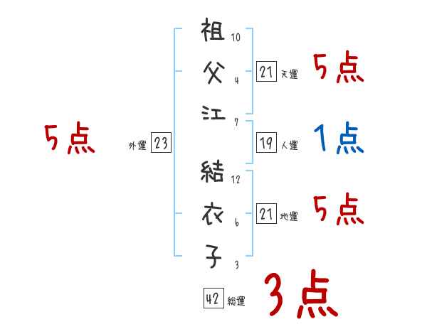 | 天運  | 祖父江結衣子さんの天運は21画の5つ星!統率力がある。独立し成功する。名誉を手に入れる。家系が持つ宿命的な運勢を表します。祖先から受け継いだ苗字ですので自分の力が及びません。家柄を象徴します。 |