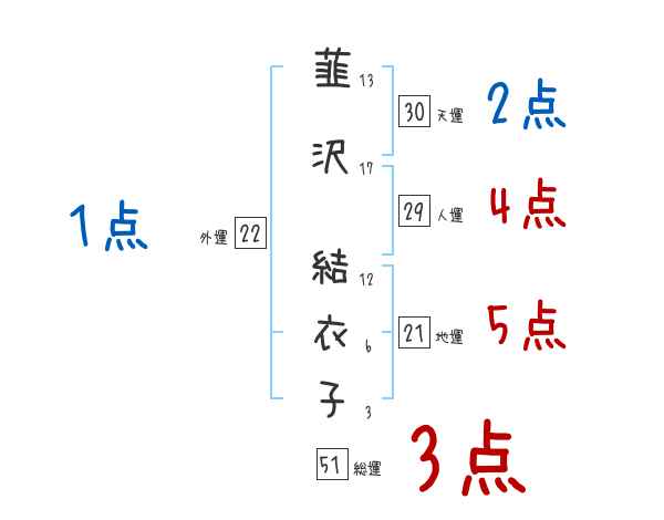 外運![]() | 韮沢結衣子さんの外運は22画の1つ星!努力することが苦手ないっぽう手先が器用。芸術性にも優れる。 生活面を象徴する運勢です。外部から受ける影響力を表し、結婚運、家庭運や職場、環境への順応性を表します。 |