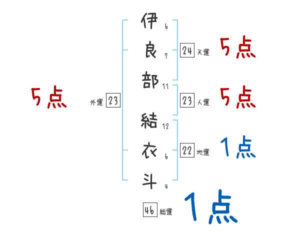 総運![]() | 伊良部結衣斗さんの総運は46画の1つ星!迷走することが多く苦労するかも。目先のことにとらわれないように。 あなたの人生を表す1番重要な運勢です。生涯を通じて影響する総合運となり、主に50歳以降の晩年期に影響を及ぼします。 |