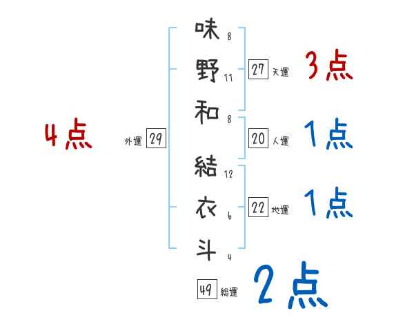 外運![]() | 味野和結衣斗さんの外運は29画の4つ星!完全主義で才能がある。厳格な心の持ち主。 生活面を象徴する運勢です。外部から受ける影響力を表し、結婚運、家庭運や職場、環境への順応性を表します。 |