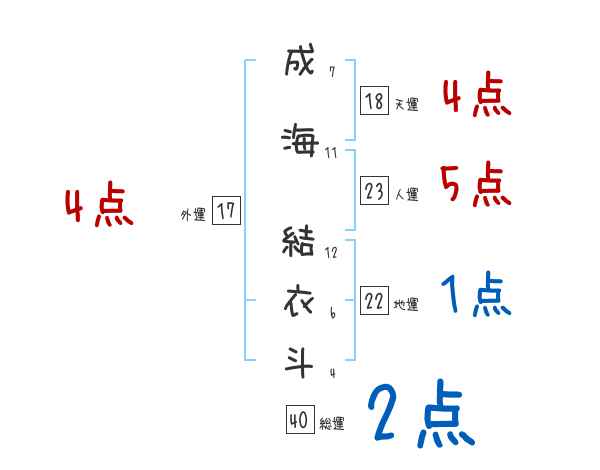 人運![]() | 成海結衣斗さんの人運は23画の5つ星!想像力に優れ活力がある。一代で成功し名誉を手に入れる。 性格や才能などを表す2番目に重要な運勢です。人間関係や協調性、社会的な成功に影響します。主に20歳から50歳ぐらいまでの中年期の運勢を表します。 |
