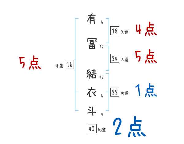 外運![]() | 有冨結衣斗さんの外運は16画の5つ星!人望が厚く大きく発展する。逆転成功が見える。 生活面を象徴する運勢です。外部から受ける影響力を表し、結婚運、家庭運や職場、環境への順応性を表します。 |