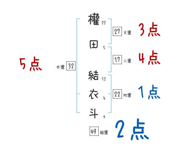外運![]() | 權田結衣斗さんの外運は32画の5つ星!柔軟性があり成功する。チャンスが多く金運が良い。 生活面を象徴する運勢です。外部から受ける影響力を表し、結婚運、家庭運や職場、環境への順応性を表します。 |