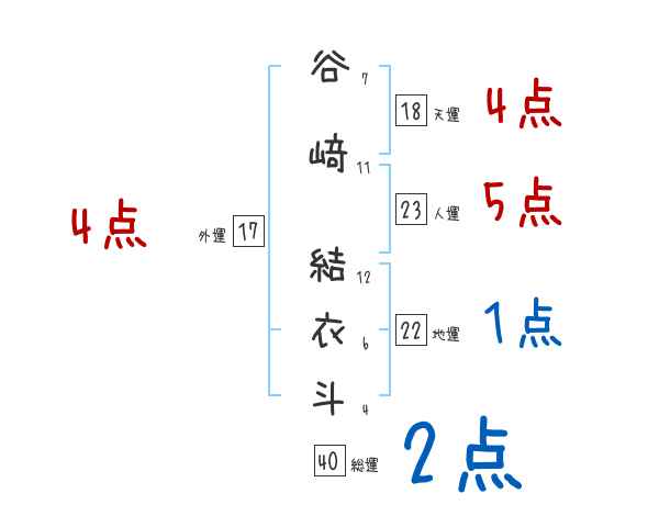 人運![]() | 谷﨑結衣斗さんの人運は23画の5つ星!想像力に優れ活力がある。一代で成功し名誉を手に入れる。 性格や才能などを表す2番目に重要な運勢です。人間関係や協調性、社会的な成功に影響します。主に20歳から50歳ぐらいまでの中年期の運勢を表します。 |
