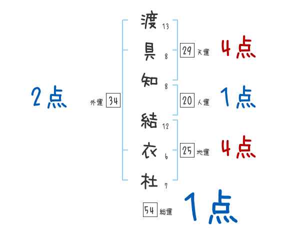 外運![]() | 渡具知結衣杜さんの外運は34画の2つ星!独創性に優れるが、自尊心が強く災難に注意しましょう。 生活面を象徴する運勢です。外部から受ける影響力を表し、結婚運、家庭運や職場、環境への順応性を表します。 |
