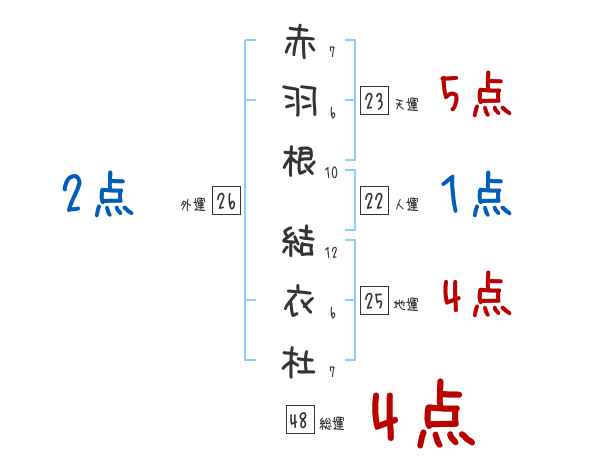 天運![]() | 赤羽根結衣杜さんの天運は23画の5つ星!想像力に優れ活力がある。一代で成功し名誉を手に入れる。 家系が持つ宿命的な運勢を表します。祖先から受け継いだ苗字ですので自分の力が及びません。家柄を象徴します。 |