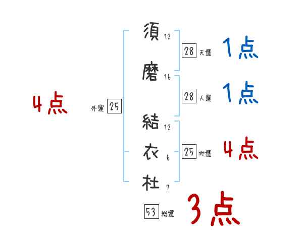 天運![]() | 須磨結衣杜さんの天運は28画の1つ星!家庭環境に注意。スポーツで活躍できる能力があるかも。 家系が持つ宿命的な運勢を表します。祖先から受け継いだ苗字ですので自分の力が及びません。家柄を象徴します。 |