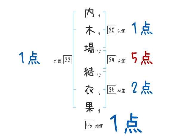 地運![]() | 内木場結衣果さんの地運は26画の2つ星!波瀾万丈かも。信頼できる人を大事にしましょう。 個性を表す基礎的な運勢です。性格形成や対人関係、行動力など家庭環境に影響されます。主に誕生してから20歳くらいまでの若年期の運勢を表します。 |