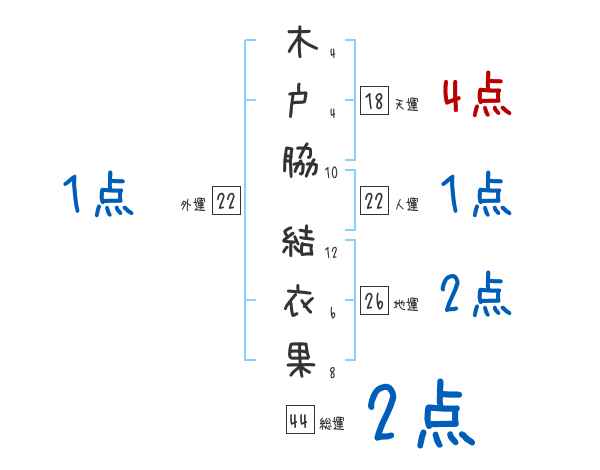 天運![]() | 木戸脇結衣果さんの天運は18画の4つ星!情熱的で剛気。忍耐力があり信頼される。 家系が持つ宿命的な運勢を表します。祖先から受け継いだ苗字ですので自分の力が及びません。家柄を象徴します。 |