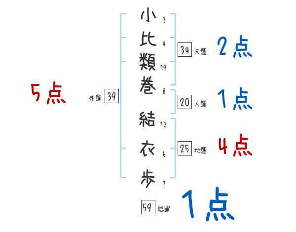 外運![]() | 小比類巻結衣歩さんの外運は39画の5つ星!社交性に優れ人望が厚い。人の上に立ち成功する。 生活面を象徴する運勢です。外部から受ける影響力を表し、結婚運、家庭運や職場、環境への順応性を表します。 |