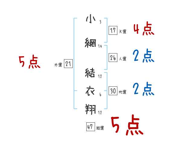 天運![]() | 小網結衣翔さんの天運は17画の4つ星!積極的な行動力。地位を気づき財産を手に入れる。純粋な心と直感力。 家系が持つ宿命的な運勢を表します。祖先から受け継いだ苗字ですので自分の力が及びません。家柄を象徴します。 |