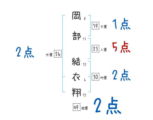 外運![]() | 岡部結衣翔さんの外運は26画の2つ星!波瀾万丈かも。信頼できる人を大事にしましょう。 生活面を象徴する運勢です。外部から受ける影響力を表し、結婚運、家庭運や職場、環境への順応性を表します。 |