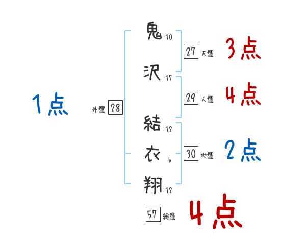 総運![]() | 鬼沢結衣翔さんの総運は57画の4つ星!向上心があり人望がある。地位を得る。 あなたの人生を表す1番重要な運勢です。生涯を通じて影響する総合運となり、主に50歳以降の晩年期に影響を及ぼします。 |