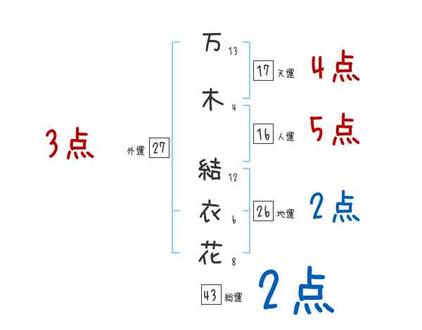 外運![]() | 万木結衣花さんの外運は27画の3つ星!頭脳明晰だが強情で摩擦が多い傾向。孤立に注意。 生活面を象徴する運勢です。外部から受ける影響力を表し、結婚運、家庭運や職場、環境への順応性を表します。 |