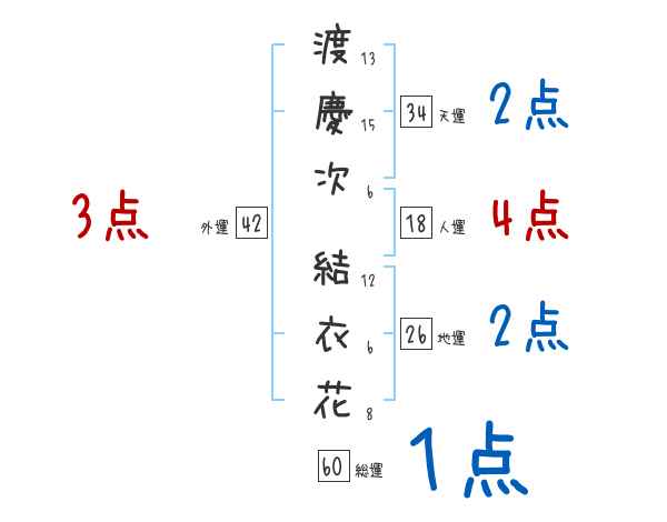 外運![]() | 渡慶次結衣花さんの外運は42画の3つ星!病気に注意。多芸であるが消極的でおとなしい。 生活面を象徴する運勢です。外部から受ける影響力を表し、結婚運、家庭運や職場、環境への順応性を表します。 |