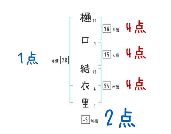 外運![]() | 樋口結衣里さんの外運は28画の1つ星!家庭環境に注意。スポーツで活躍できる能力があるかも。 生活面を象徴する運勢です。外部から受ける影響力を表し、結婚運、家庭運や職場、環境への順応性を表します。 |