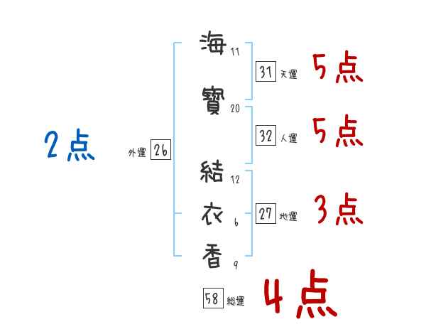 人運![]() | 海寳結衣香さんの人運は32画の5つ星!柔軟性があり成功する。チャンスが多く金運が良い。 性格や才能などを表す2番目に重要な運勢です。人間関係や協調性、社会的な成功に影響します。主に20歳から50歳ぐらいまでの中年期の運勢を表します。 |