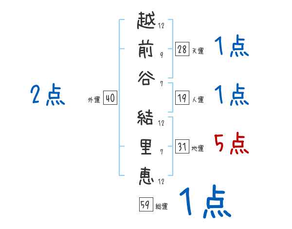 天運![]() | 越前谷結里恵さんの天運は28画の1つ星!家庭環境に注意。スポーツで活躍できる能力があるかも。 家系が持つ宿命的な運勢を表します。祖先から受け継いだ苗字ですので自分の力が及びません。家柄を象徴します。 |