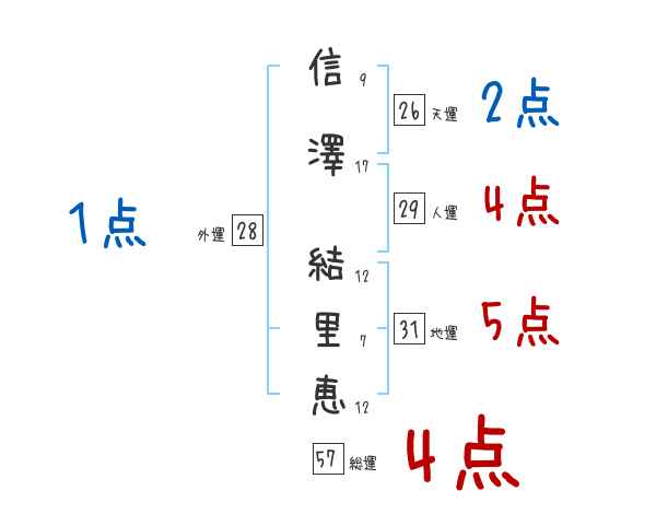 外運![]() | 信澤結里恵さんの外運は28画の1つ星!家庭環境に注意。スポーツで活躍できる能力があるかも。 生活面を象徴する運勢です。外部から受ける影響力を表し、結婚運、家庭運や職場、環境への順応性を表します。 |