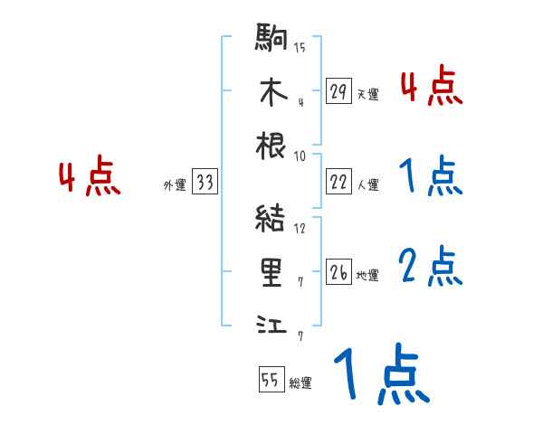 外運![]() | 駒木根結里江さんの外運は33画の4つ星!権力志向でプライドが高い。勇気があり運を切り開き成功する。 生活面を象徴する運勢です。外部から受ける影響力を表し、結婚運、家庭運や職場、環境への順応性を表します。 |