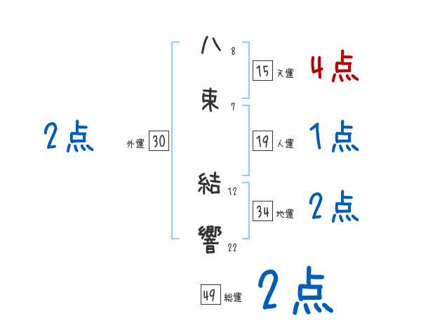 総運![]() | 八束結響さんの総運は49画の2つ星!不安定な性格で明暗がある人生。周りの人には支援されやすい。 あなたの人生を表す1番重要な運勢です。生涯を通じて影響する総合運となり、主に50歳以降の晩年期に影響を及ぼします。 |