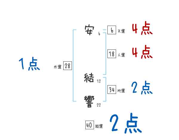 外運![]() | 安結響さんの外運は28画の1つ星!家庭環境に注意。スポーツで活躍できる能力があるかも。 生活面を象徴する運勢です。外部から受ける影響力を表し、結婚運、家庭運や職場、環境への順応性を表します。 |