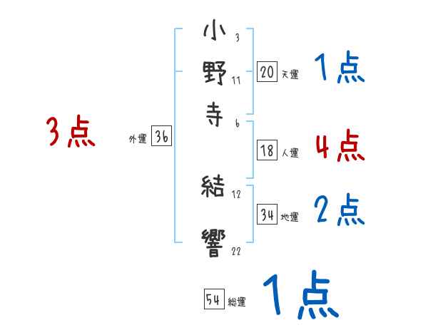 外運![]() | 小野寺結響さんの外運は36画の3つ星!先見性が豊かです。多少神経質で苦労することも。 生活面を象徴する運勢です。外部から受ける影響力を表し、結婚運、家庭運や職場、環境への順応性を表します。 |