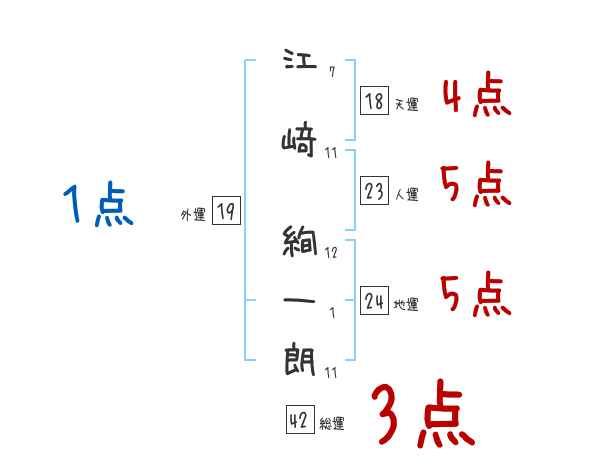 外運![]() | 江﨑絢一朗さんの外運は19画の1つ星!優れた才能を持ちますが、協調性が足りないことも。周りの人と協力する事を意識しましょう。 生活面を象徴する運勢です。外部から受ける影響力を表し、結婚運、家庭運や職場、環境への順応性を表します。 |