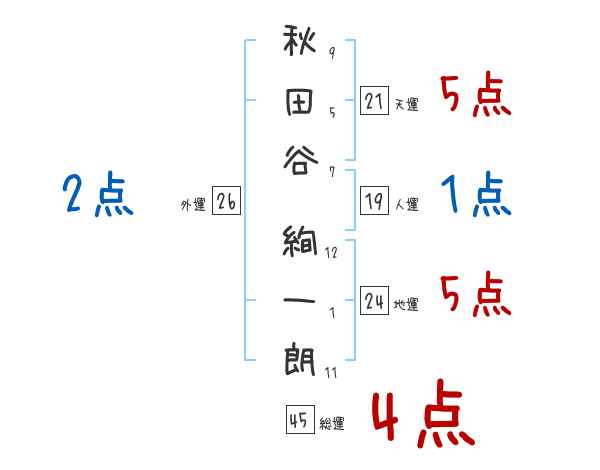 総運![]() | 秋田谷絢一朗さんの総運は45画の4つ星!もくもくと物事を進め達成する。地味な努力家。 あなたの人生を表す1番重要な運勢です。生涯を通じて影響する総合運となり、主に50歳以降の晩年期に影響を及ぼします。 |