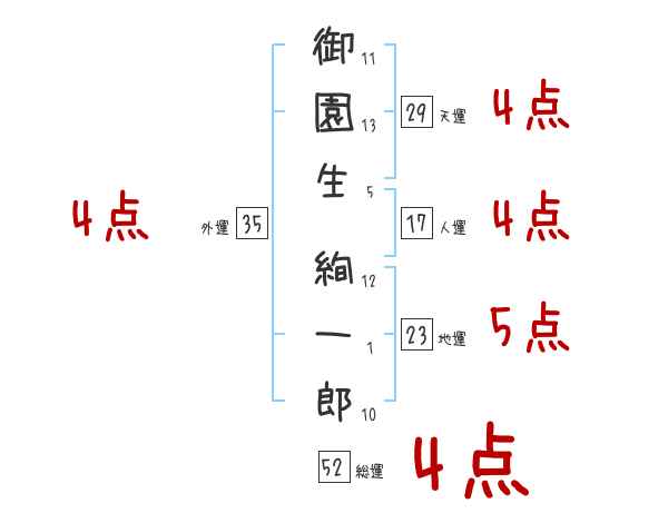 外運![]() | 御園生絢一郎さんの外運は35画の4つ星!温厚な性格で感受性が高い。穏和な性格で人望が厚い。 生活面を象徴する運勢です。外部から受ける影響力を表し、結婚運、家庭運や職場、環境への順応性を表します。 |