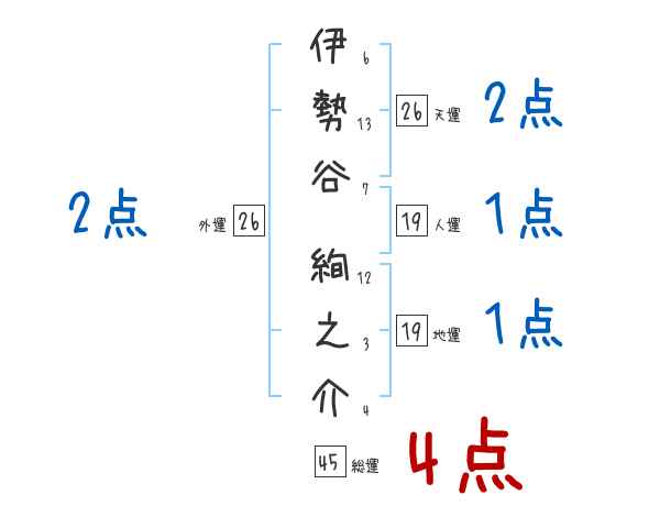 天運![]() | 伊勢谷絢之介さんの天運は26画の2つ星!波瀾万丈かも。信頼できる人を大事にしましょう。 家系が持つ宿命的な運勢を表します。祖先から受け継いだ苗字ですので自分の力が及びません。家柄を象徴します。 |