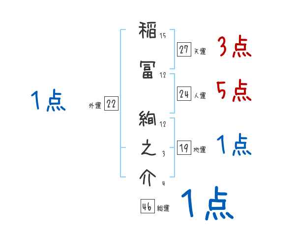 総運![]() | 稲冨絢之介さんの総運は46画の1つ星!迷走することが多く苦労するかも。目先のことにとらわれないように。 あなたの人生を表す1番重要な運勢です。生涯を通じて影響する総合運となり、主に50歳以降の晩年期に影響を及ぼします。 |