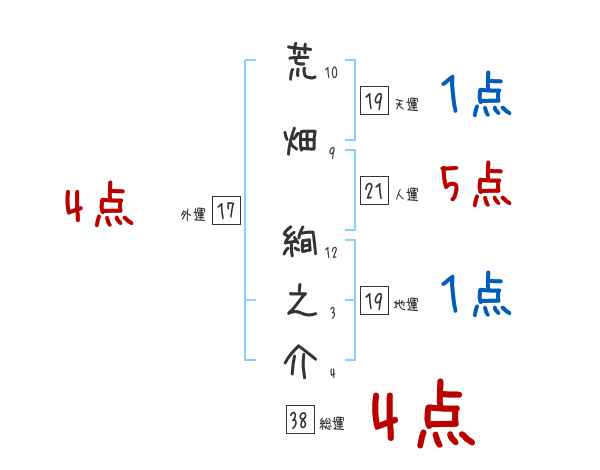 天運![]() | 荒畑絢之介さんの天運は19画の1つ星!優れた才能を持ちますが、協調性が足りないことも。周りの人と協力する事を意識しましょう。 家系が持つ宿命的な運勢を表します。祖先から受け継いだ苗字ですので自分の力が及びません。家柄を象徴します。 |