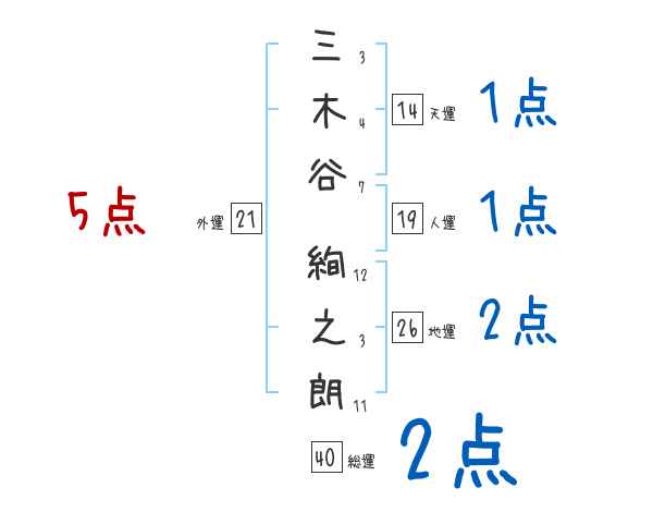 外運![]() | 三木谷絢之朗さんの外運は21画の5つ星!統率力がある。独立し成功する。名誉を手に入れる。 生活面を象徴する運勢です。外部から受ける影響力を表し、結婚運、家庭運や職場、環境への順応性を表します。 |