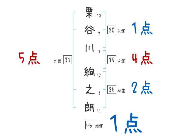 外運![]() | 栗谷川絢之朗さんの外運は31画の5つ星!社交性があり判断力に優れる。順風満帆な人生で円満な生活。 生活面を象徴する運勢です。外部から受ける影響力を表し、結婚運、家庭運や職場、環境への順応性を表します。 |
