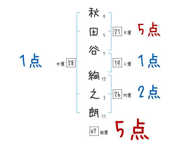天運![]() | 秋田谷絢之朗さんの天運は21画の5つ星!統率力がある。独立し成功する。名誉を手に入れる。 家系が持つ宿命的な運勢を表します。祖先から受け継いだ苗字ですので自分の力が及びません。家柄を象徴します。 |
